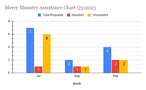 During the third quarter of 2025, Mercy Ministries received thirteen (13) requests for assistance, and we were able to meet four (4) of those needs. Though not every situation could be supported, we remain thankful that the Lord continues to bring people across our path, giving us opportunities to care, pray, and walk alongside them as we are able.