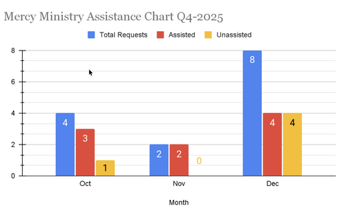 We closed the year with gratitude, reflecting on how the Lord continued to bring needs before us, and how He faithfully provided opportunities to respond with care, wisdom, and prayer. During the fourth quarter, Mercy Ministries received 14 requests for assistance, and we were able to support 9 individuals.