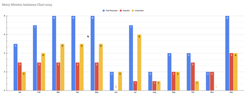 In 2025, Mercy Ministries received 65 requests and assisted in 28 cases. Requests that could not be supported were most often due to recent prior assistance, location outside our service area, lack of follow-through, or funding constraints at certain times of the year.